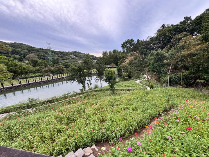 喝過茶後,便從貓空站旁的小路進樟樹步道。這條步道是貓空最親民的親子路線,全長約1.1公里,坡度平緩。步道兩旁是古樸的農村造景:相思炭窯仍散發淡淡炭香、土角厝靜立在茶園邊,還有保留下來的豬舍,可幻想昔日茶農世代的日常。由夏入秋,雖然少了魯冰花花海,卻多了層層紅葉和野花,路邊的埤塘映照藍天,穀倉轉轉風車輕轉,遠山層疊,空氣中芬多精濃郁,吸一口就覺得肺部被洗滌。